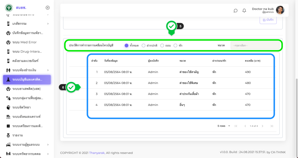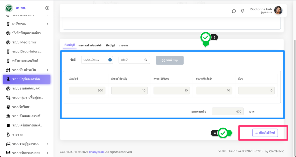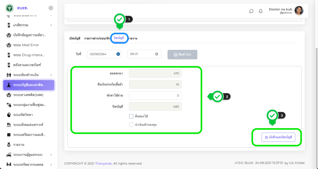 ข้อที่ 1-2 เลือก รายการปิดบัญชี->ตรวจสอบยอดเงินที่คงค้างในบัญชี และหักรายการใช้จ่ายก่อนปิดบัญชี และสามารถนำเงินเข้ากองทุนผู้ป่วยได้