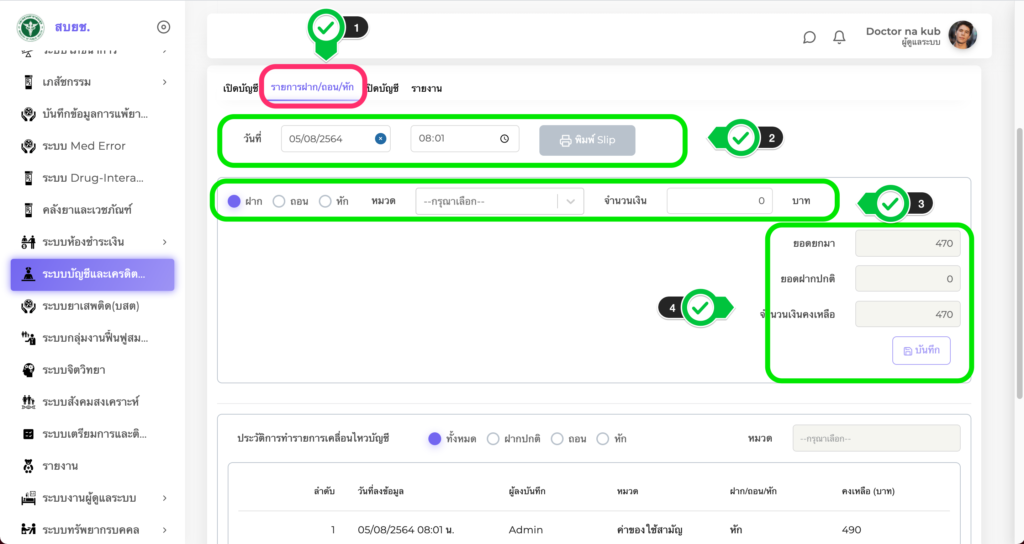 ข้อที่ 4 แสดงยอดเงินที่มี และยอดจำนวณฝาก/ถอน/หัก และบันทึกรายได้การ
